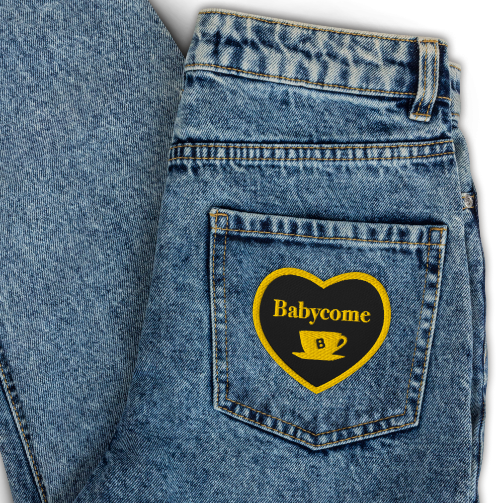 Babycomeロゴと、懐かしのMama Tea Break の目を引く刺繍デザインが、シンプルなアイテムにちょっとした遊び心と個性をプラスしてくれます。