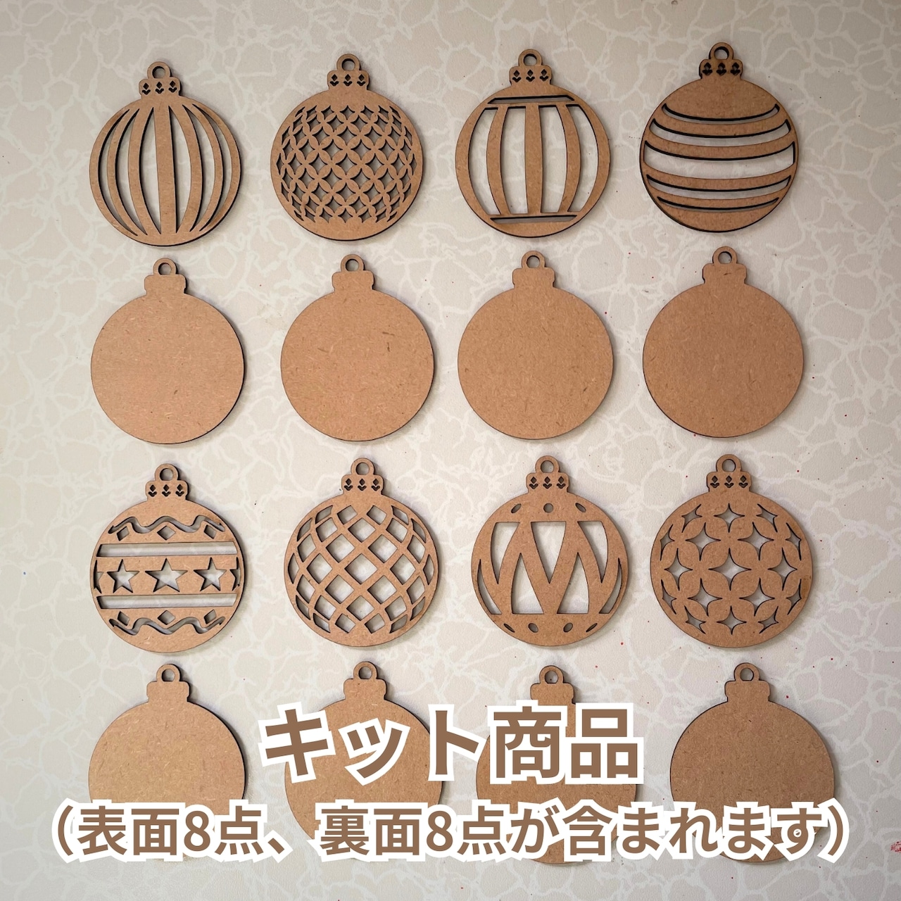 木製の“表面パーツ”と無地の“裏面パーツ”がそれぞれ8点ずつ入ったキットは、
